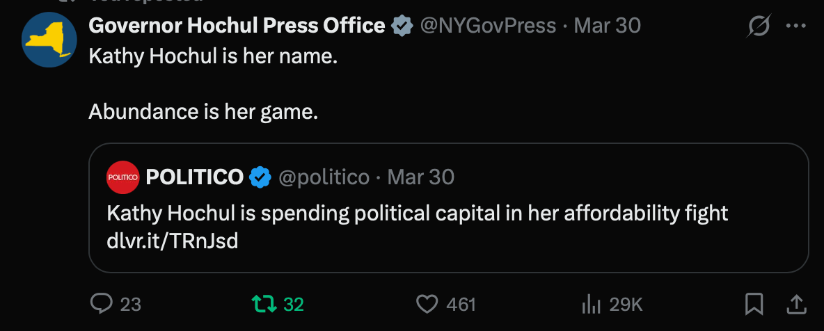 From housing to energy, it’s clear that abundance thinking is shaping the policy debates about how to lower prices. But it’s also been promising that abundance is increasingly influencing the 2028 conversation. Illinois Gov. JB Pritzker is saying “it’s time to build,” Pennsylvania Gov. Shapiro has made “Get Shit Done” his slogan, and California Gov. Newsom is telling Los Angeles that dragging their feet on housing goals is UNACCEPTABLE (his emphasis, not ours). Meanwhile, we’re seeing this from New York:
